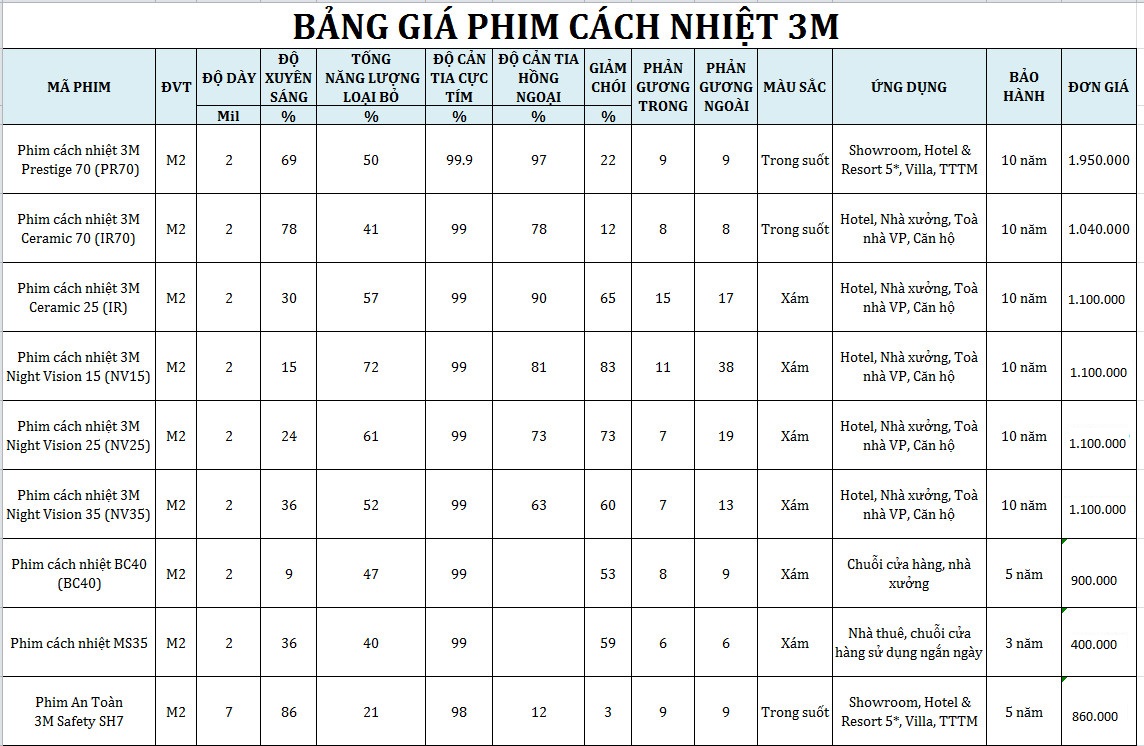Kính gửi quý khách hàng bảng giá phim cách nhiệt nhà kính 3M