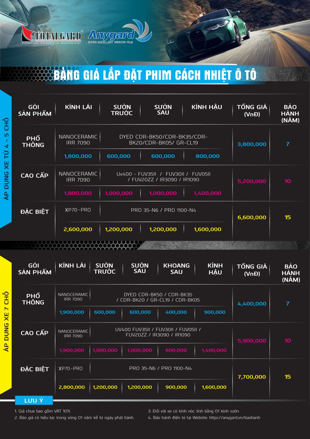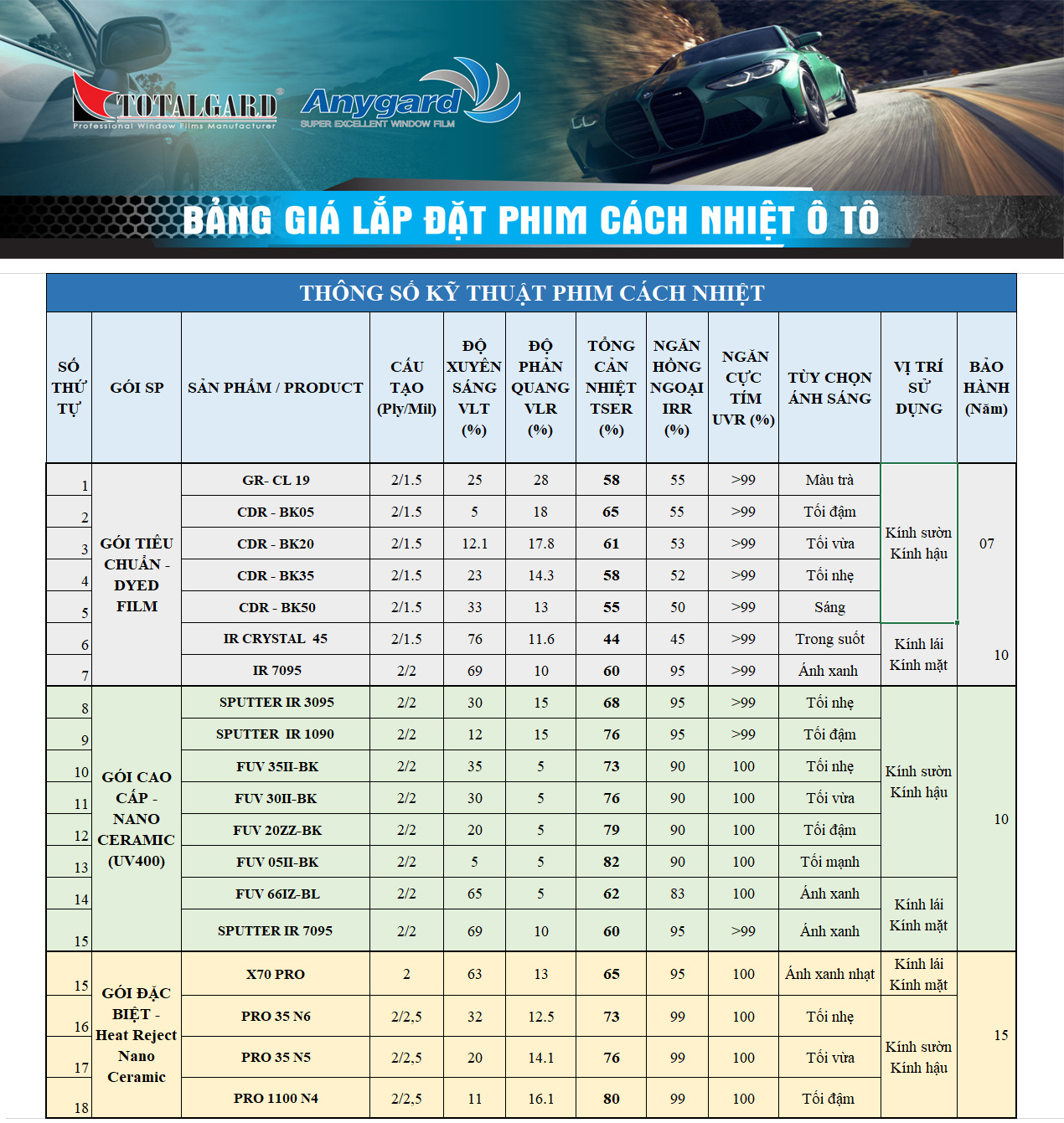 Bảng Thông Số Kĩ Thuật Gói Phim Cách Nhiệt Ô Tô